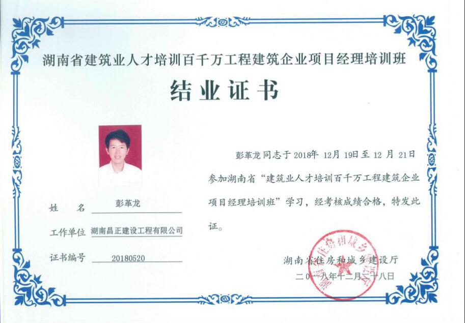 2018年12月19日-21日,我公司公司副总经理周海文同志、项目经理彭革龙同志参加了第三期湖南省“建筑业人才培训百万工程”项目经理培训班,通过理论学习并进行质量、安全标准化示范工程现场观摩,最终取得了结业证书。通过此次培训,公司将最新的学习内容传达至各项目部,望各项目部负责人加强学习,共同进步。
