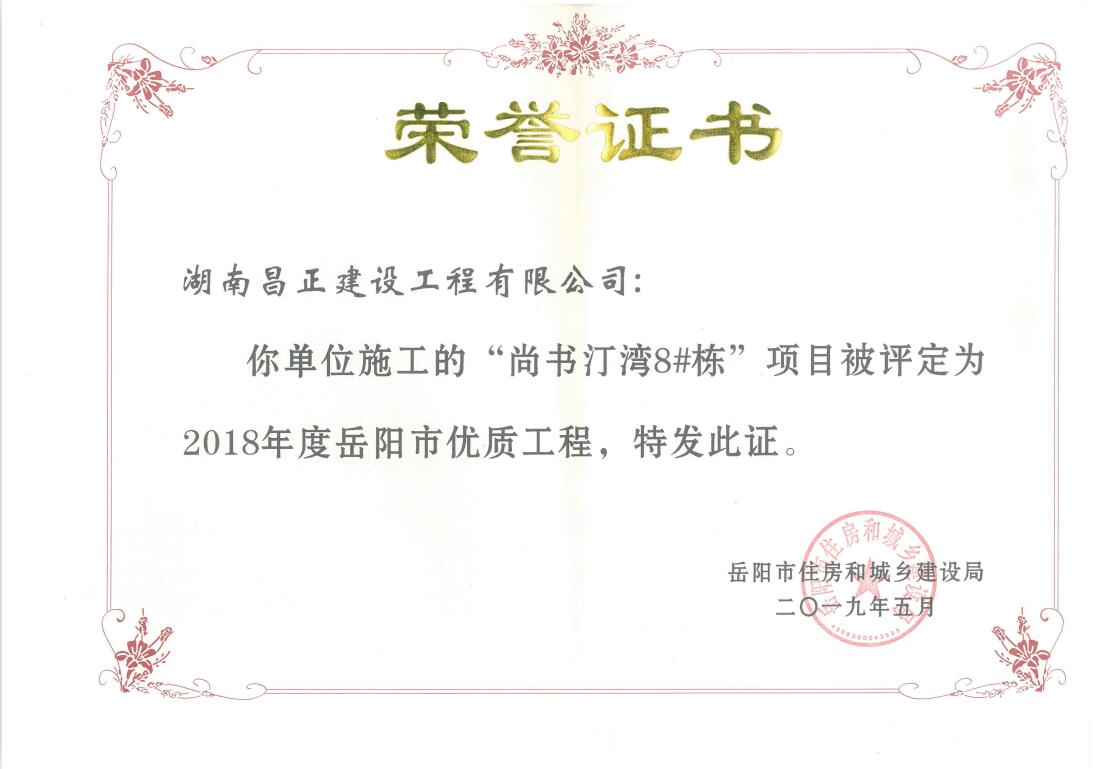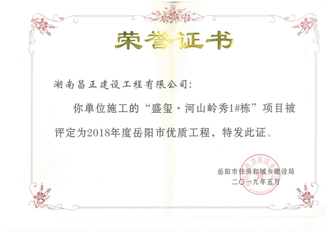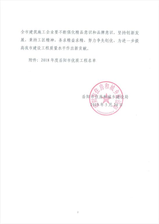我司承建的洞庭·美域项目、盛玺·河山岭秀项目、尚书汀湾项目荣获2018年度岳阳市优质工程