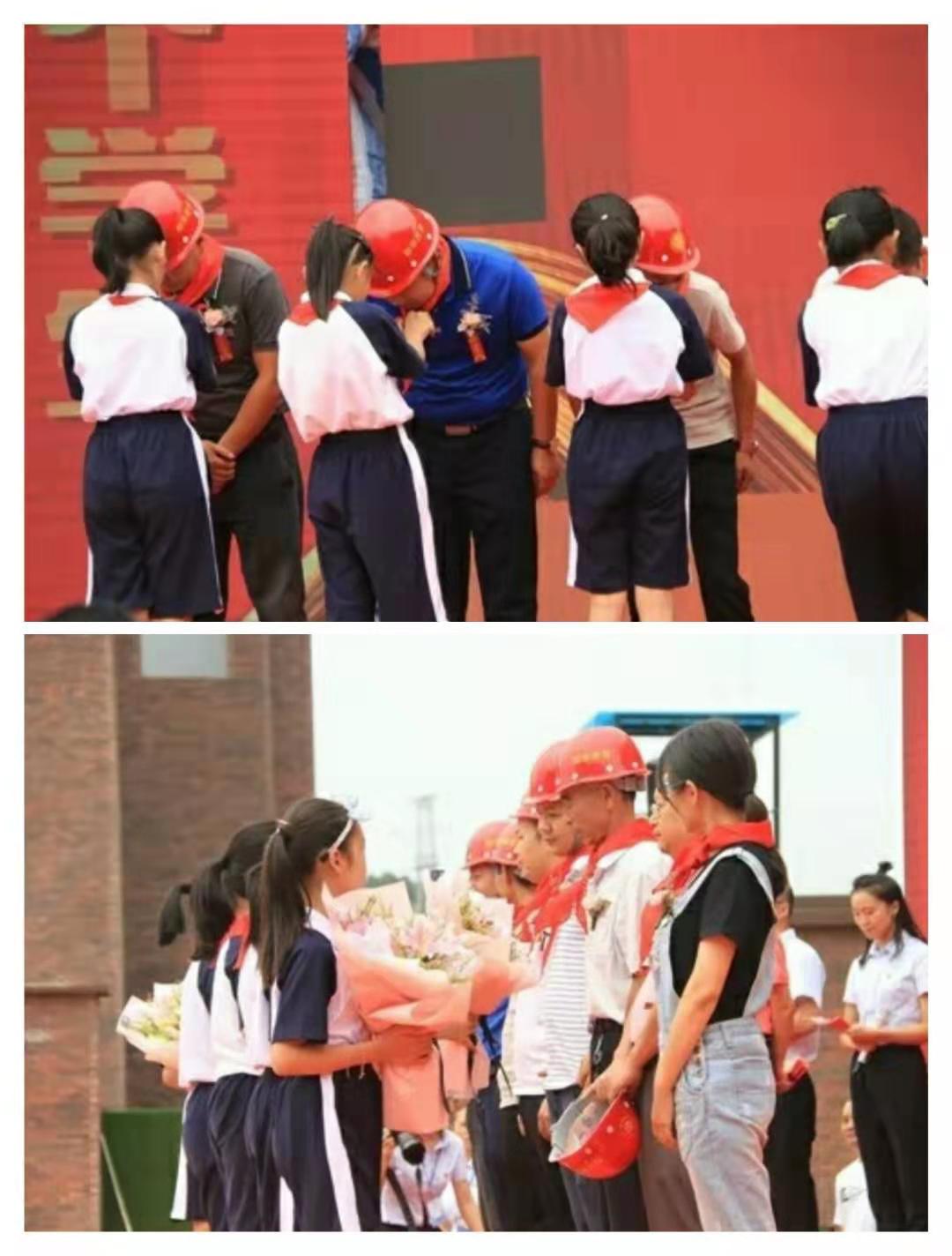典礼现场,岳阳郡华学校将我司项目部数位施工建设者请上舞台,学生代表为建设者们献上鲜花和红领巾,并向建设者们敬上队礼,献上了他们诚挚的敬意。