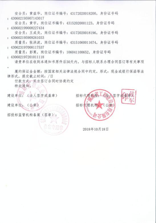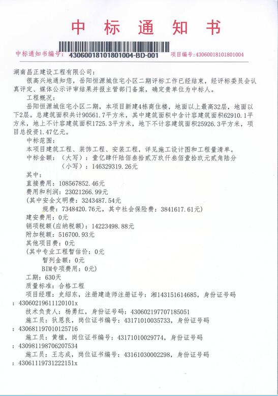 2018年10月18日,公司中标岳阳恒源城住宅小区二期工程。 岳阳恒源城住宅小区二期工程位于经开区狮子山路以东、科技路以南,包含4栋商住楼,其中,6号楼层数为地上31层,地下2层;5号、7号楼为地上32层,地下2层;8号楼为3层幼儿园,总建筑面积共计90561.7㎡。 公司将立即组织项目部进场开始施工。