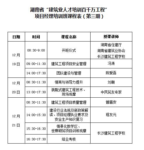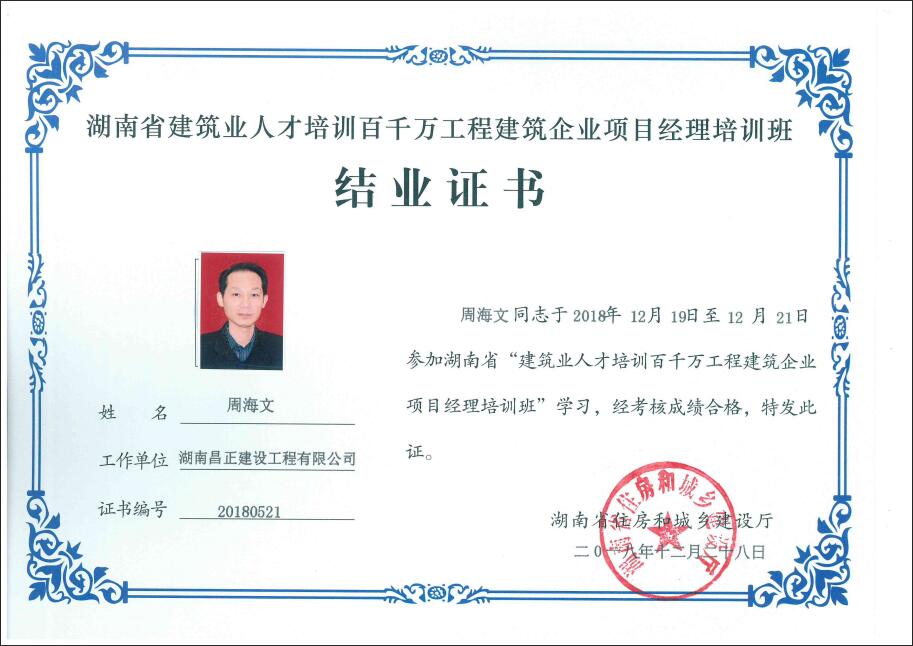 2018年12月19日-21日,我公司公司副总经理周海文同志、项目经理彭革龙同志参加了第三期湖南省“建筑业人才培训百万工程”项目经理培训班,通过理论学习并进行质量、安全标准化示范工程现场观摩,最终取得了结业证书。通过此次培训,公司将最新的学习内容传达至各项目部,望各项目部负责人加强学习,共同进步。