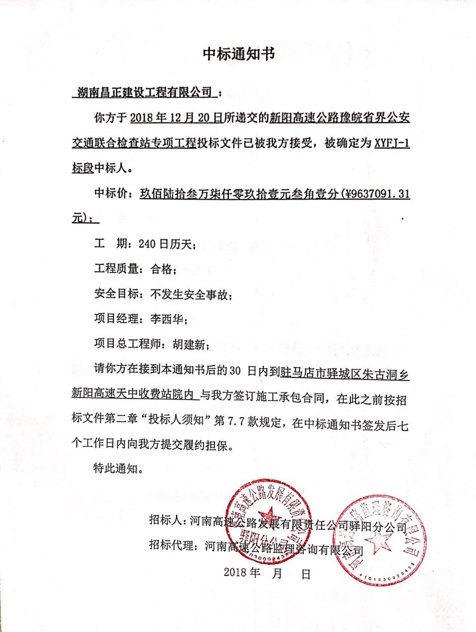 2018年12月28日,公司中标新阳高速公路豫皖省界公安交通联合检查站专项工程。