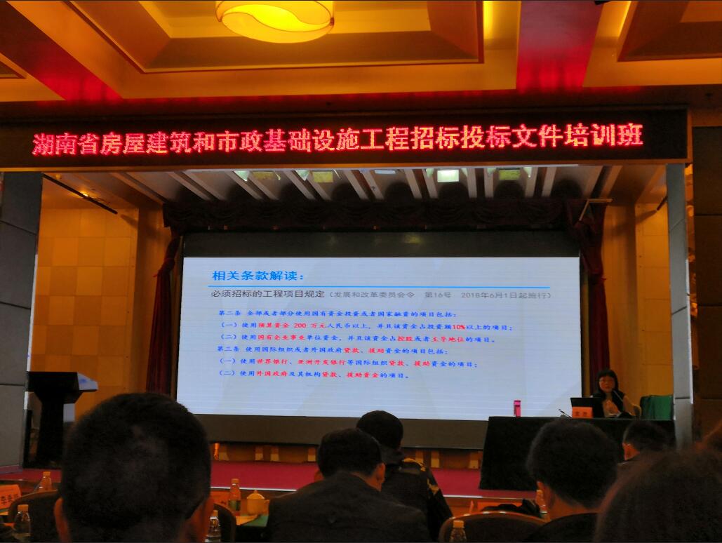 2019年3月19日,湖南省房屋建筑和市政基础设施工程招标投标文件培训班在岳阳市阿波罗御庭酒店三楼会议中心召开,该培训由湖南省建设工程招标投标协会主办、岳阳市建设工程招标投标协会协办。我公司经营管理部徐总、赵经理参加此次培训,听取培训老师解读湖南省住房和城乡建设厅印发的相关文件,培训持续两天,在两天的培训期间,培训老师由浅入深的剖析湖南省住房和城乡建设厅的相关文件,深刻的传达了相关招标投标办法。通过此次培训,我部门对湖南省住房和城乡建设厅相关办法有了更深层次的理解,是为今后进行招标投标工作的一大助力。
