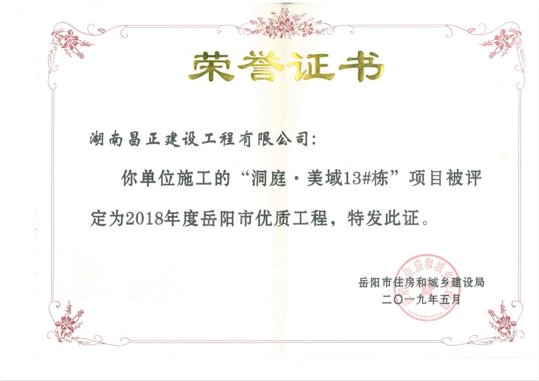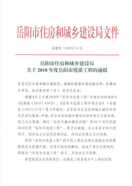 我司承建的洞庭·美域项目、盛玺·河山岭秀项目、尚书汀湾项目荣获2018年度岳阳市优质工程
