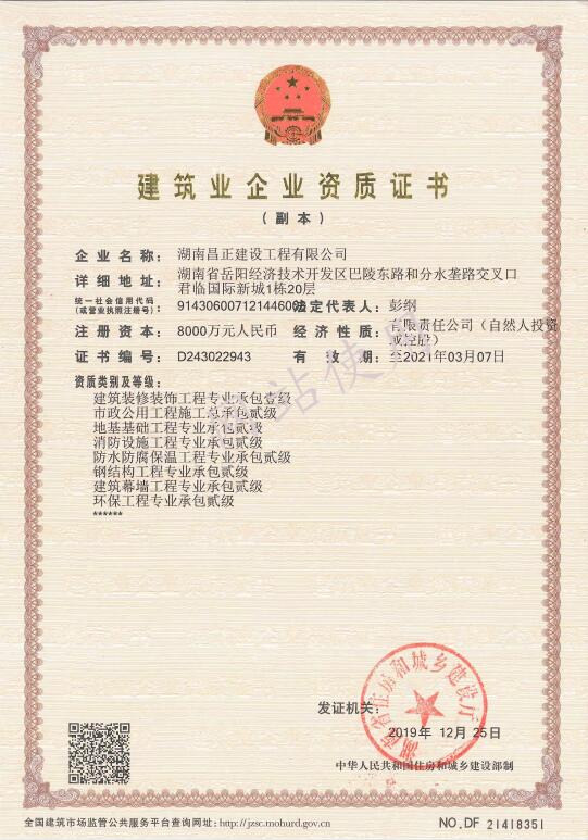 到目前为止,公司共获得了十项资质,分别是:建筑工程施工总承包、建筑装修装饰工程专业承包壹级资质;市政公用工程施工总承包、地基基础工程专业承包、消防设施工程专业承包、防水防腐保温工程专业承包、建筑幕墙工程专业承包、钢结构工程专业承包、环保工程专业承包贰级资质;以及施工劳务资质。